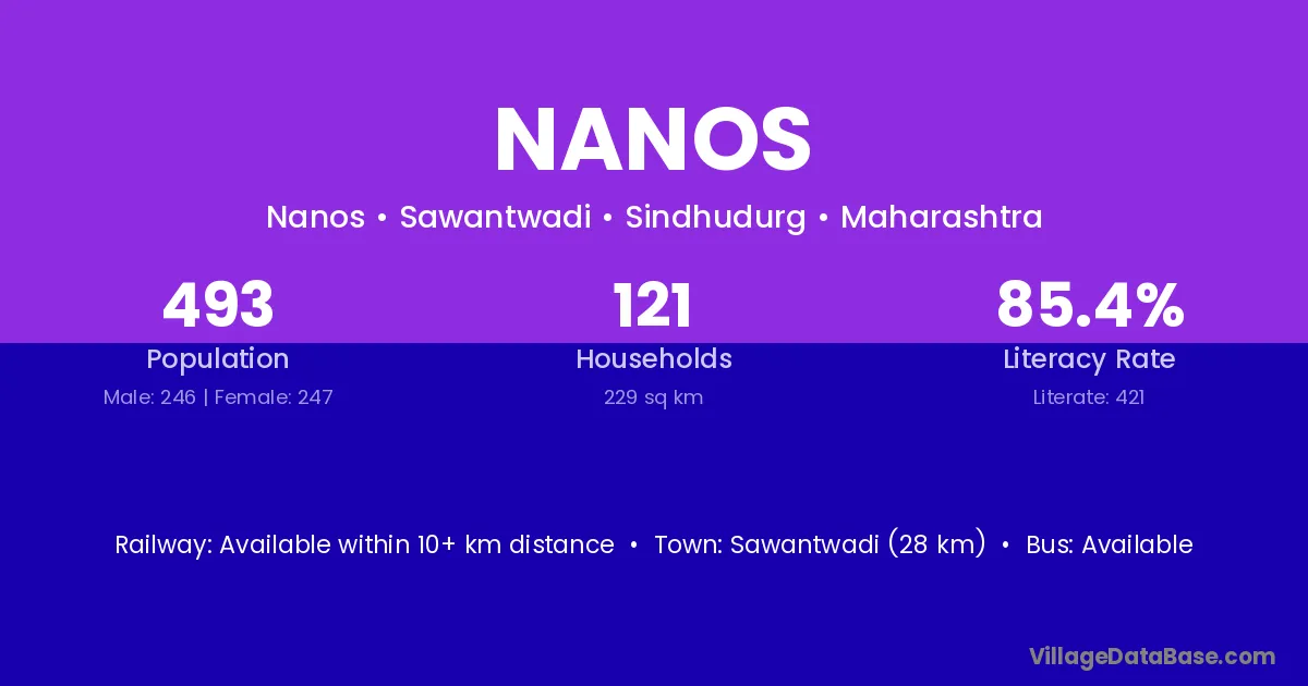 Sawantwadi (28 km) is the nearest town to Nanos village for major economic activities and is located approximately 28 km away.