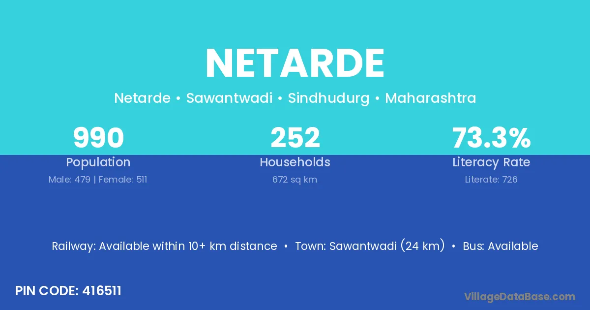 Sawantwadi (24 km) is the nearest town to Netarde village for major economic activities and is located approximately 24 km away.