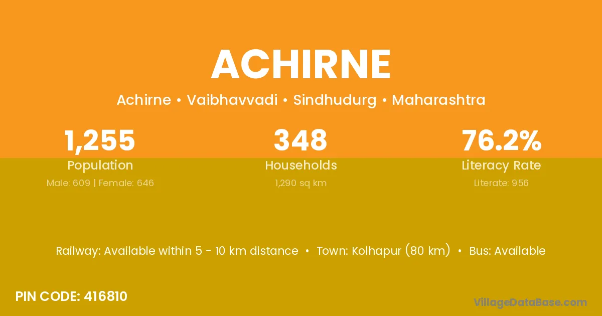 Kolhapur (80 km) is the nearest town to Achirne village for major economic activities and is located approximately 80 km away.