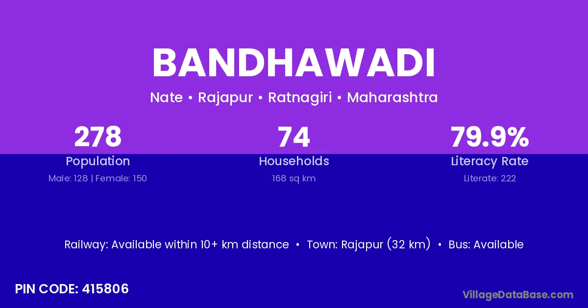 Rajapur (50 km) is the nearest town to Bandhawadi village for major economic activities and is located approximately 50 km away.