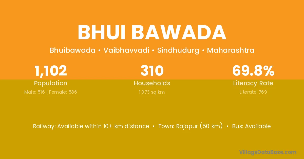 Rajapur (50 km) is the nearest town to Bhui Bawada village for major economic activities and is located approximately 50 km away.