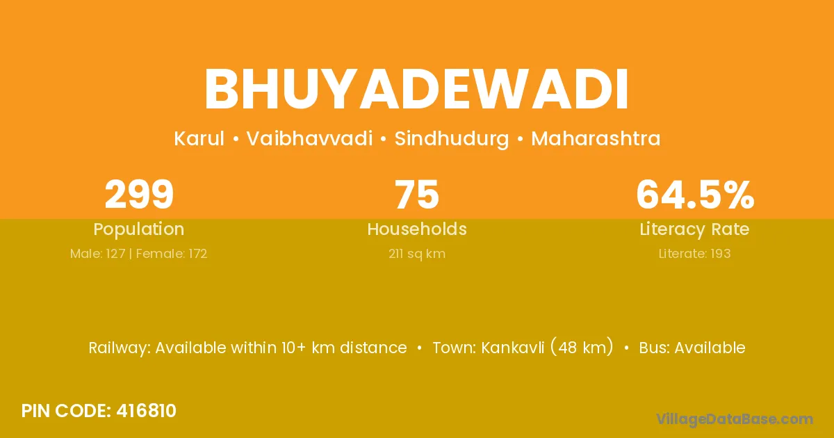 Kankavli (48 km) is the nearest town to Bhuyadewadi village for major economic activities and is located approximately 48 km away.