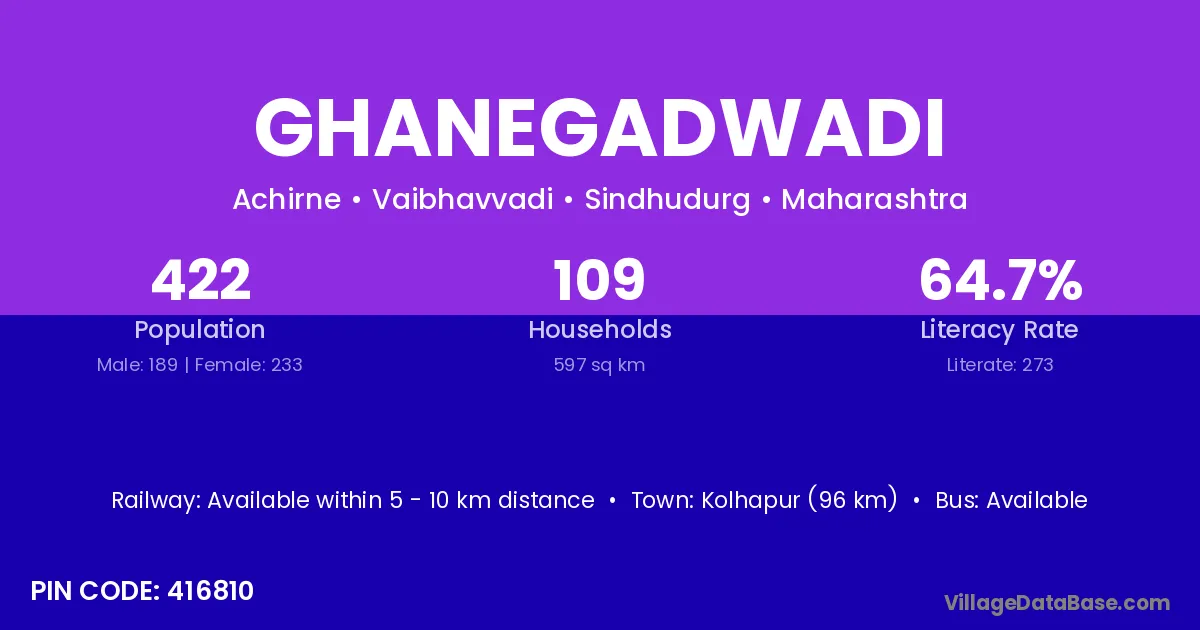 Ghanegadwadi village has a total population of 422 people, of which 189 are males and 233 are females.