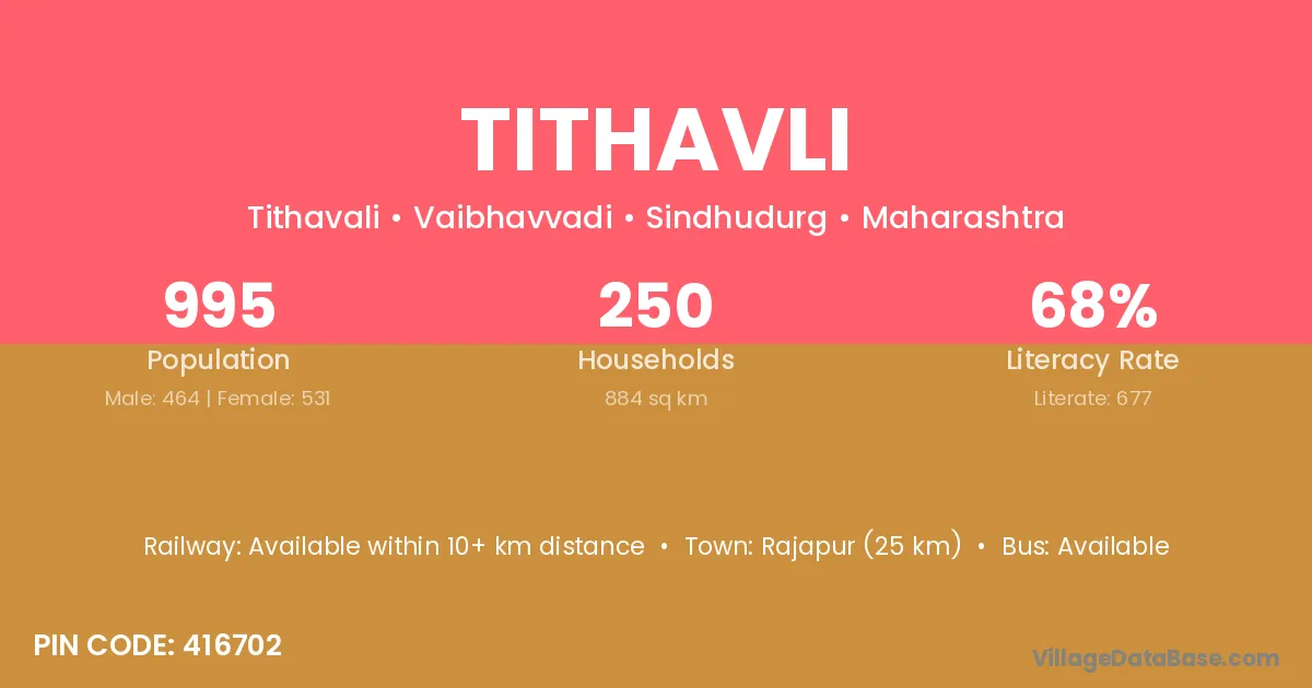 Rajapur (25 km) is the nearest town to Tithavli village for major economic activities and is located approximately 25 km away.