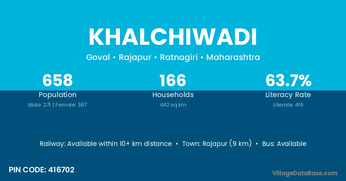 Vengurla (26 km) is the nearest town to Khalchiwadi village for major economic activities and is located approximately 26 km away.