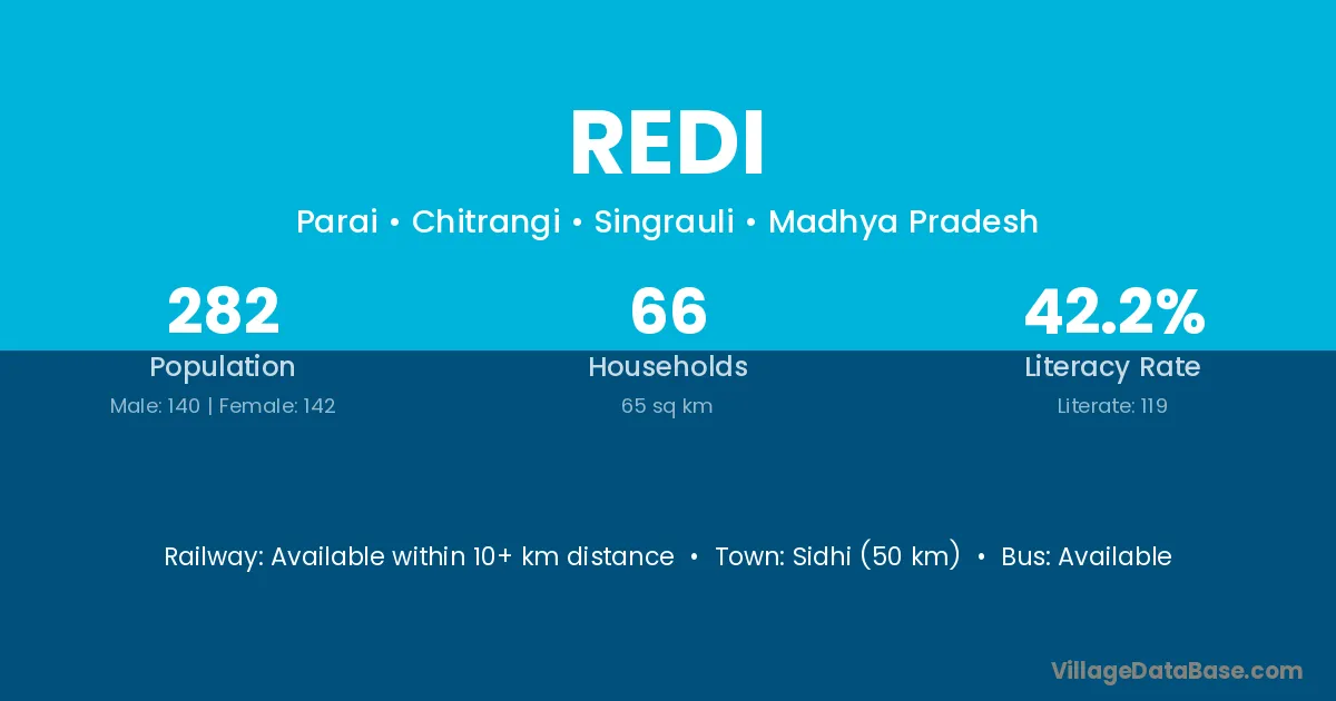 The literacy rate of Redi village is 85.40%. Male literacy stands at 86.16% and female literacy at 84.48%.