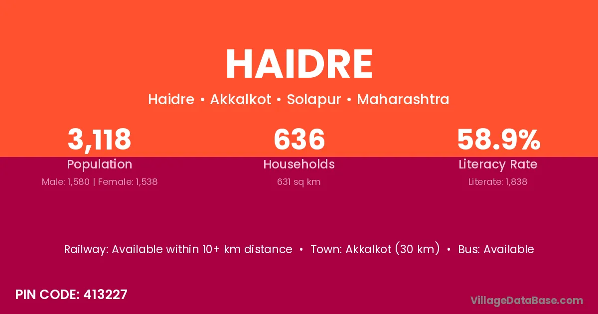 Akkalkot (30 km) is the nearest town to Haidre village for major economic activities and is located approximately 30 km away.