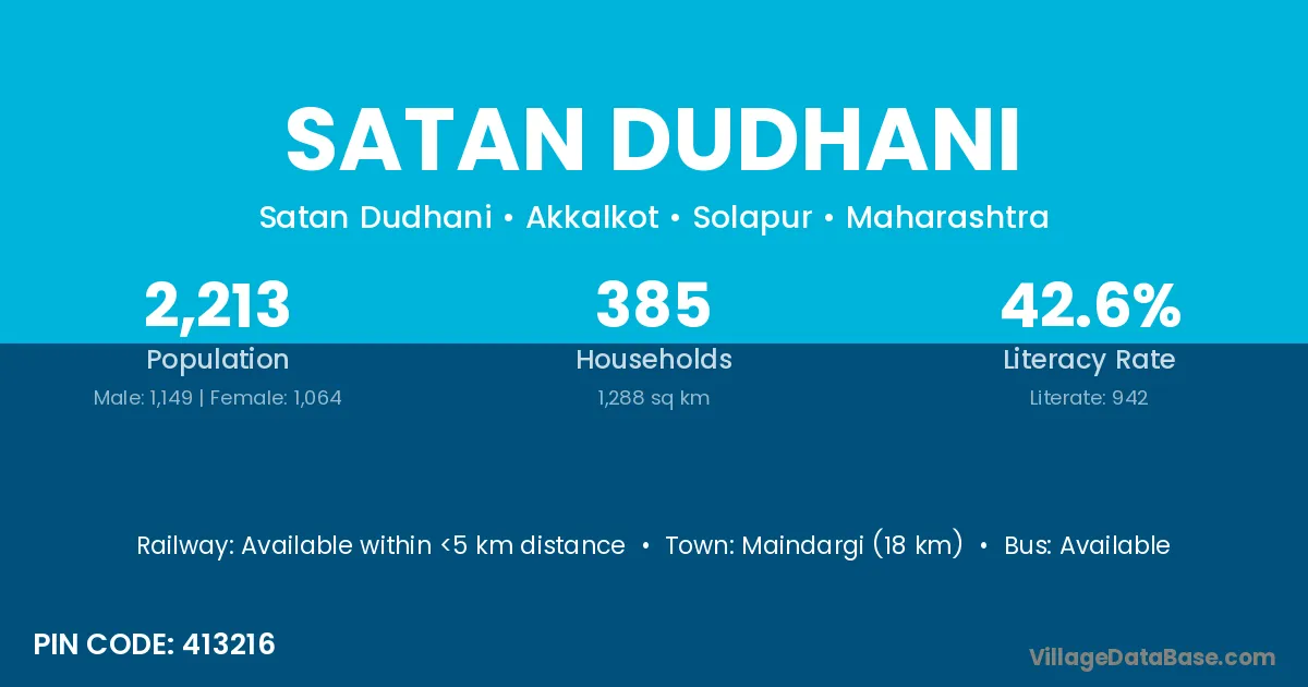 Satan Dudhani village has a total population of 2,213 people, of which 1,149 are males and 1,064 are females.