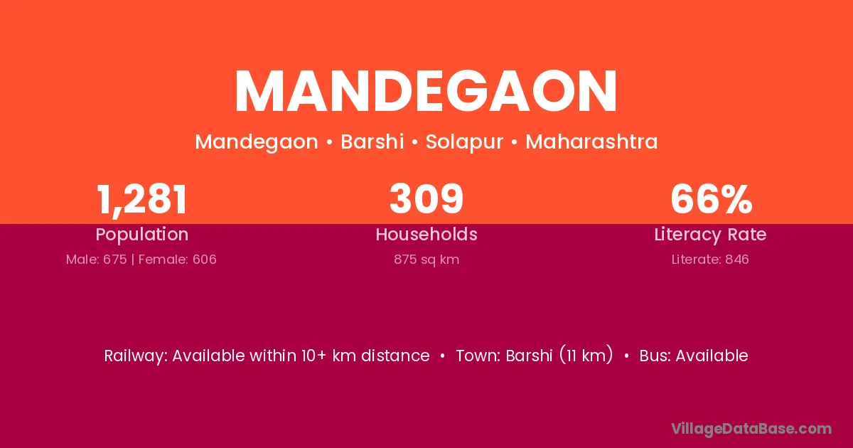 Barshi (11 km) is the nearest town to Mandegaon village for major economic activities and is located approximately 11 km away.