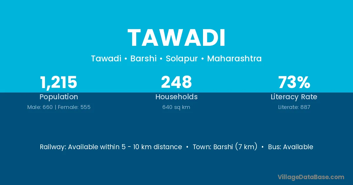 Barshi (7 km) is the nearest town to Tawadi village for major economic activities and is located approximately 7 km away.