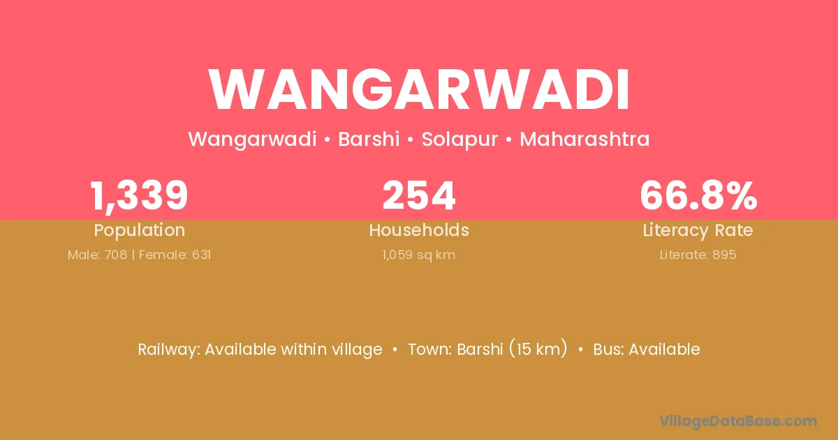 Barshi (15 km) is the nearest town to Wangarwadi village for major economic activities and is located approximately 15 km away.