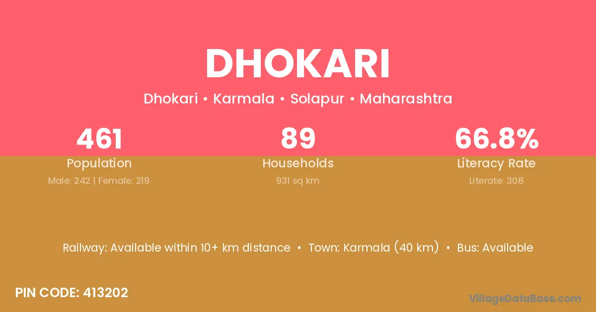 Karmala (40 km) is the nearest town to Dhokari village for major economic activities and is located approximately 40 km away.
