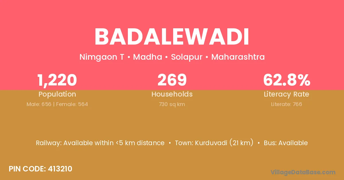 Kurduvadi (21 km) is the nearest town to Badalewadi village for major economic activities and is located approximately 21 km away.