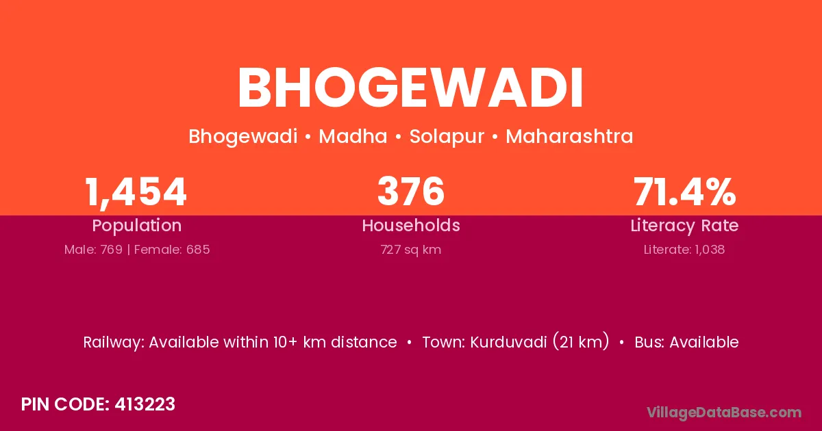 Kurduvadi (21 km) is the nearest town to Bhogewadi village for major economic activities and is located approximately 21 km away.