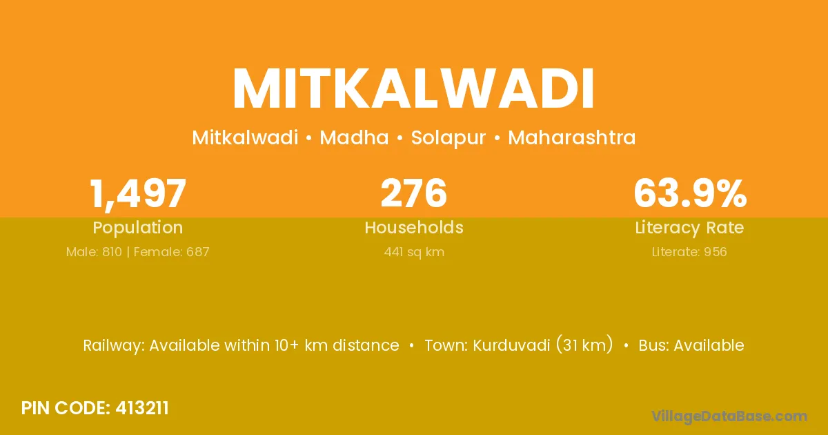Kurduvadi (31 km) is the nearest town to Mitkalwadi village for major economic activities and is located approximately 31 km away.