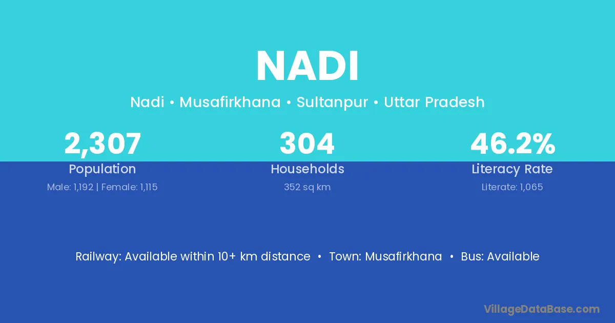 The literacy rate of Nadi village is 56.52%. Male literacy stands at 64.31% and female literacy at 47.47%.