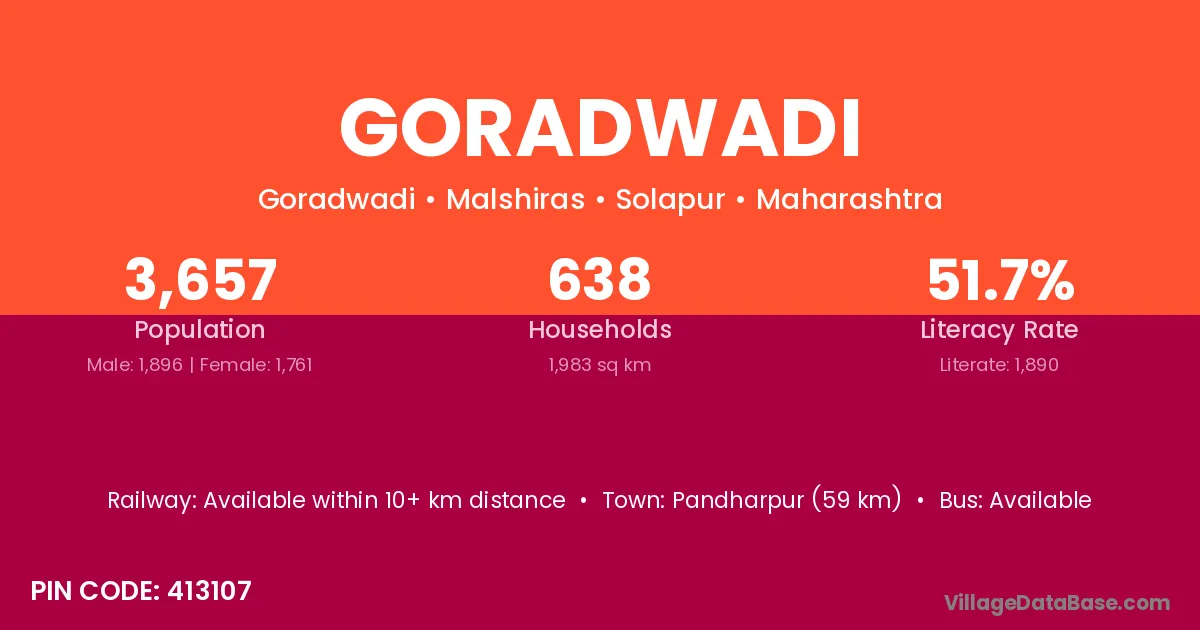 Pandharpur (59 km) is the nearest town to Goradwadi village for major economic activities and is located approximately 59 km away.