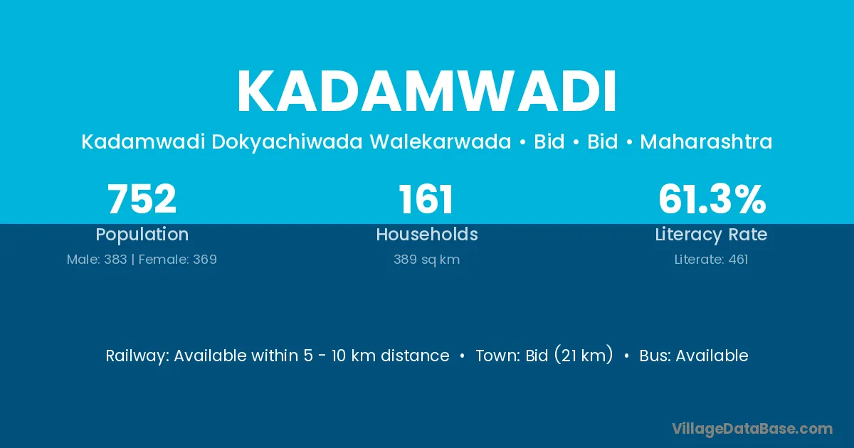 Phaltan (60 km) is the nearest town to Kadamwadi village for major economic activities and is located approximately 60 km away.
