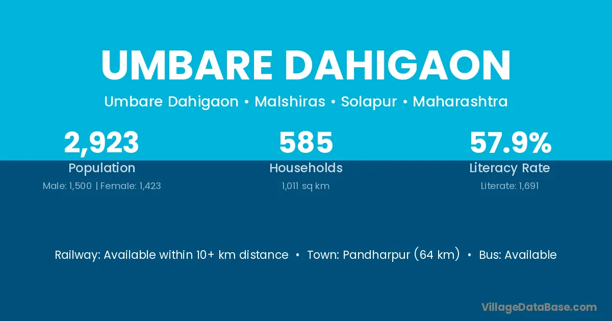 Pandharpur (64 km) is the nearest town to Umbare Dahigaon village for major economic activities and is located approximately 64 km away.