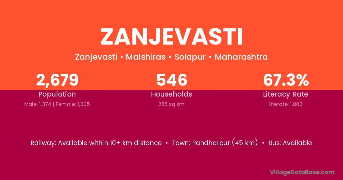 Pandharpur (45 km) is the nearest town to Zanjevasti village for major economic activities and is located approximately 45 km away.