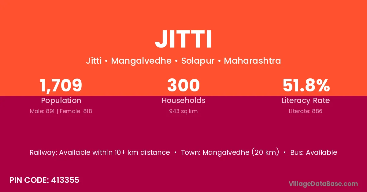 Mangalvedhe (20 km) is the nearest town to Jitti village for major economic activities and is located approximately 20 km away.