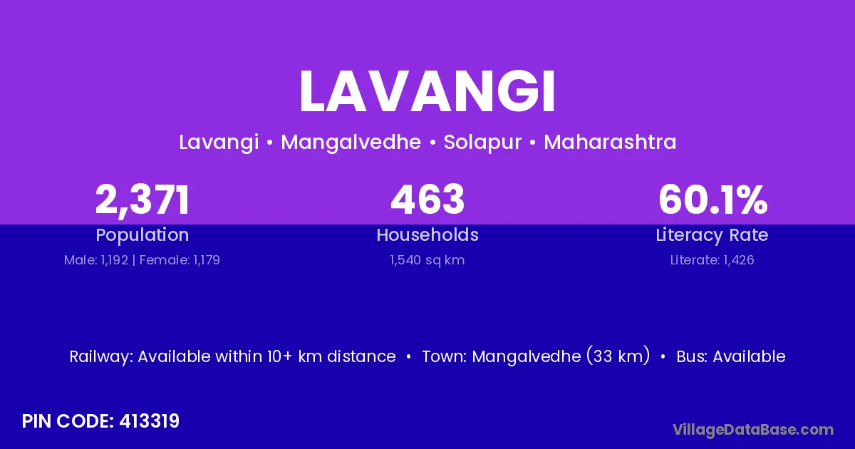 Mangalvedhe (33 km) is the nearest town to Lavangi village for major economic activities and is located approximately 33 km away.