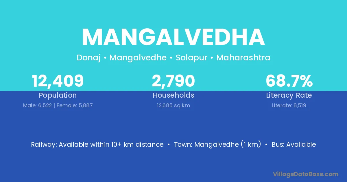 Mangalvedha village has a total population of 12,409 people, of which 6,522 are males and 5,887 are females.