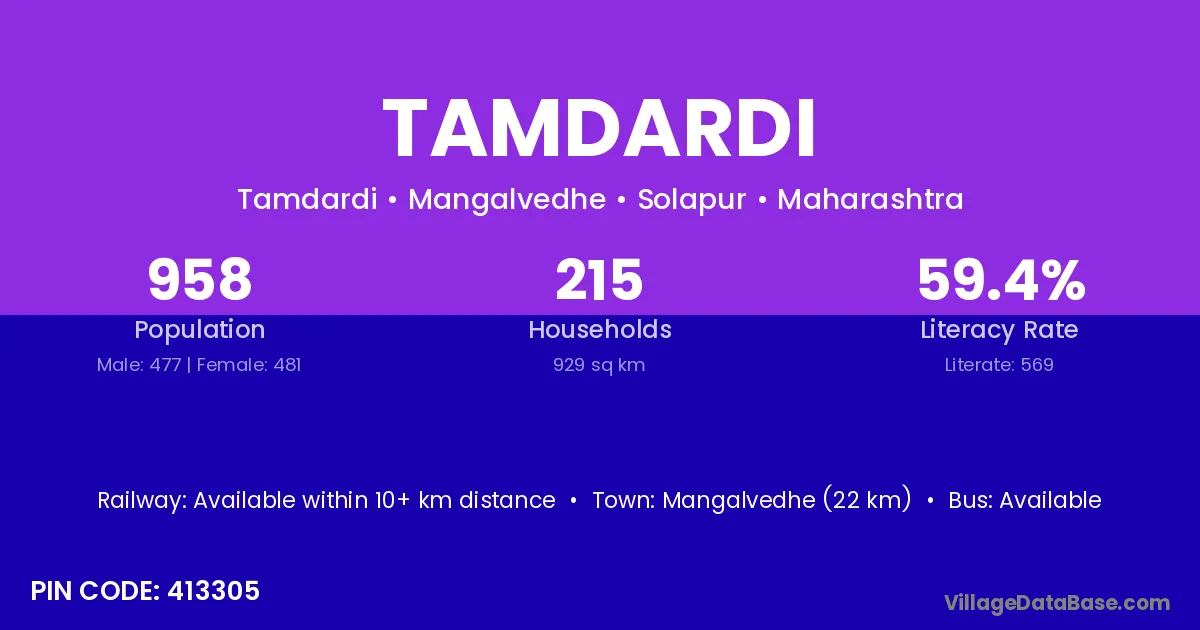 Mangalvedhe (22 km) is the nearest town to Tamdardi village for major economic activities and is located approximately 22 km away.
