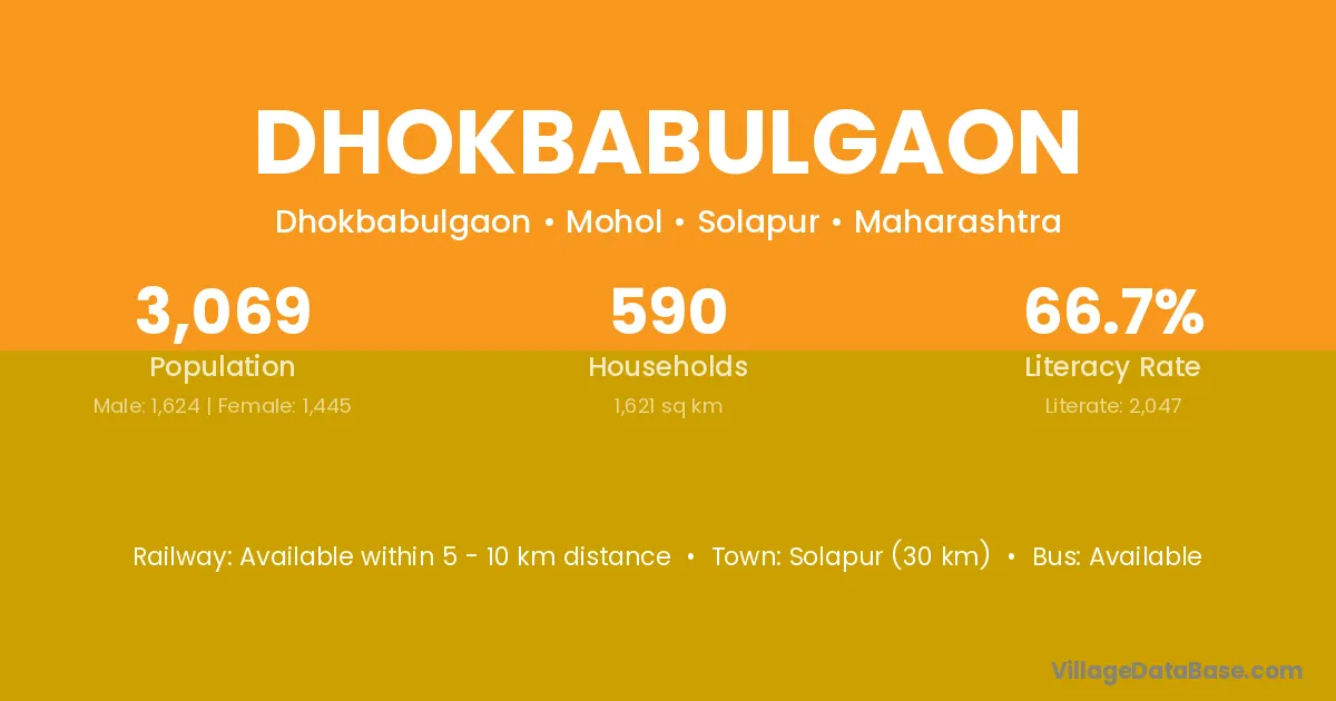 Solapur (30 km) is the nearest town to Dhokbabulgaon village for major economic activities and is located approximately 30 km away.