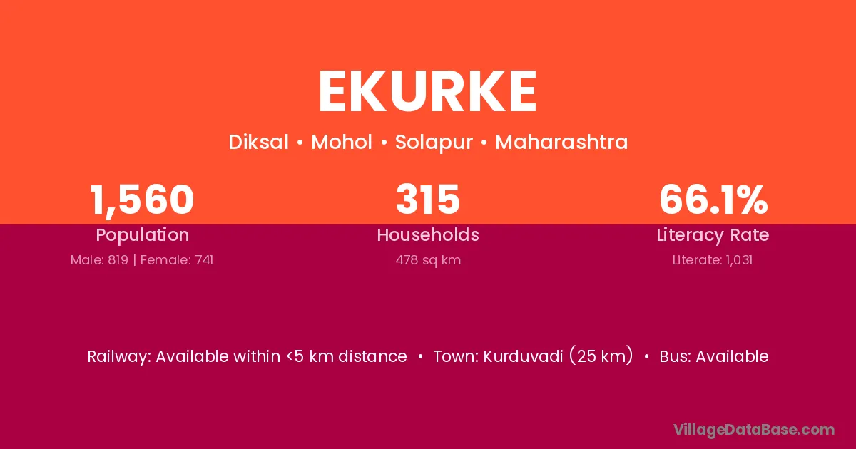 Kurduvadi (25 km) is the nearest town to Ekurke village for major economic activities and is located approximately 25 km away.