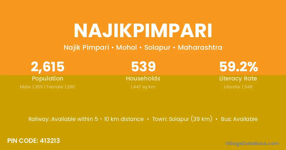 Solapur (39 km) is the nearest town to Najikpimpari village for major economic activities and is located approximately 39 km away.