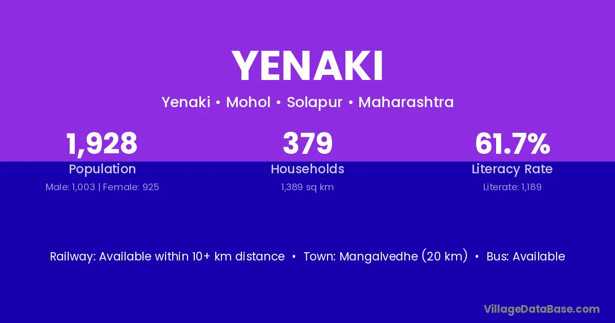 Mangalvedhe (20 km) is the nearest town to Yenaki village for major economic activities and is located approximately 20 km away.