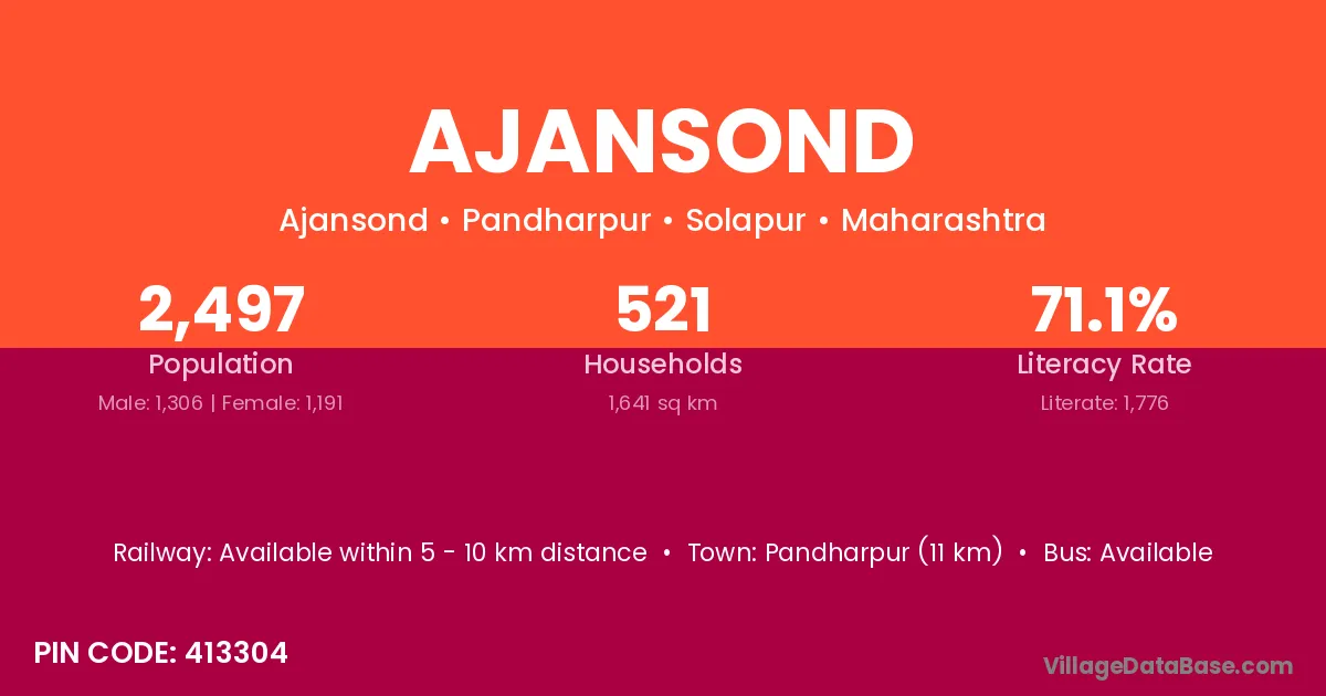 Pandharpur (11 km) is the nearest town to Ajansond village for major economic activities and is located approximately 11 km away.