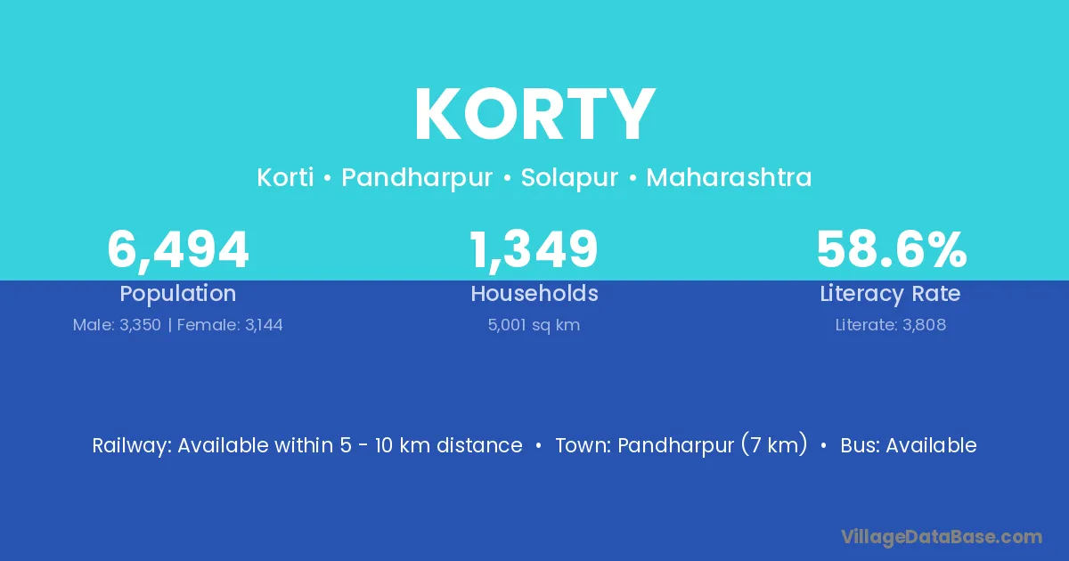 Pandharpur (7 km) is the nearest town to Korty village for major economic activities and is located approximately 7 km away.