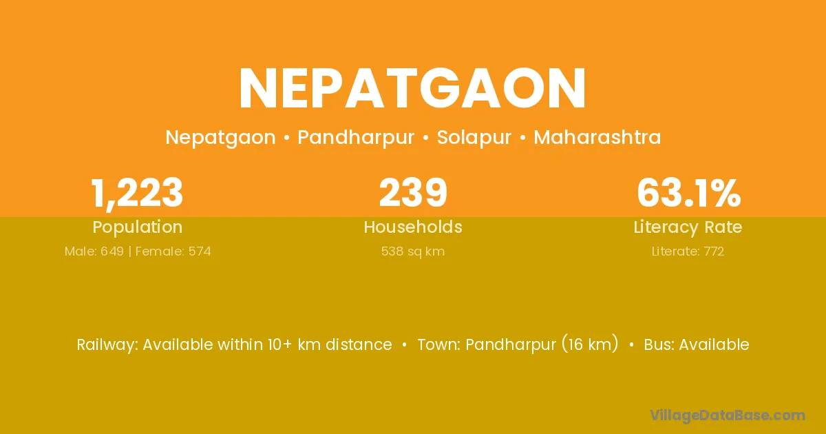 Pandharpur (16 km) is the nearest town to Nepatgaon village for major economic activities and is located approximately 16 km away.