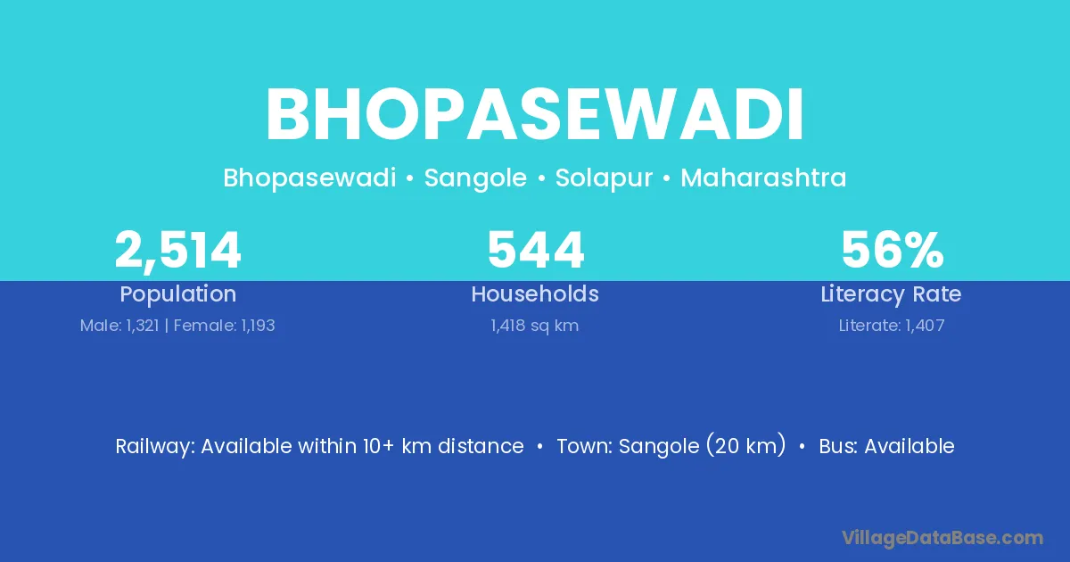 Sangole (20 km) is the nearest town to Bhopasewadi village for major economic activities and is located approximately 20 km away.