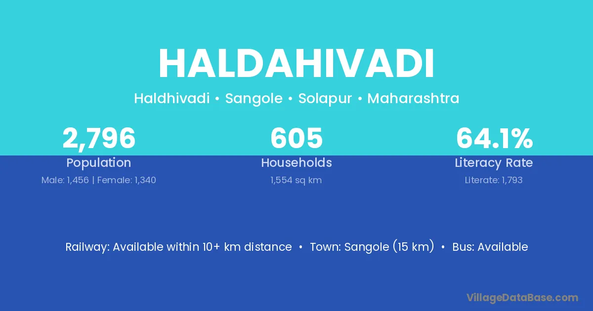 Sangole (15 km) is the nearest town to Haldahivadi village for major economic activities and is located approximately 15 km away.