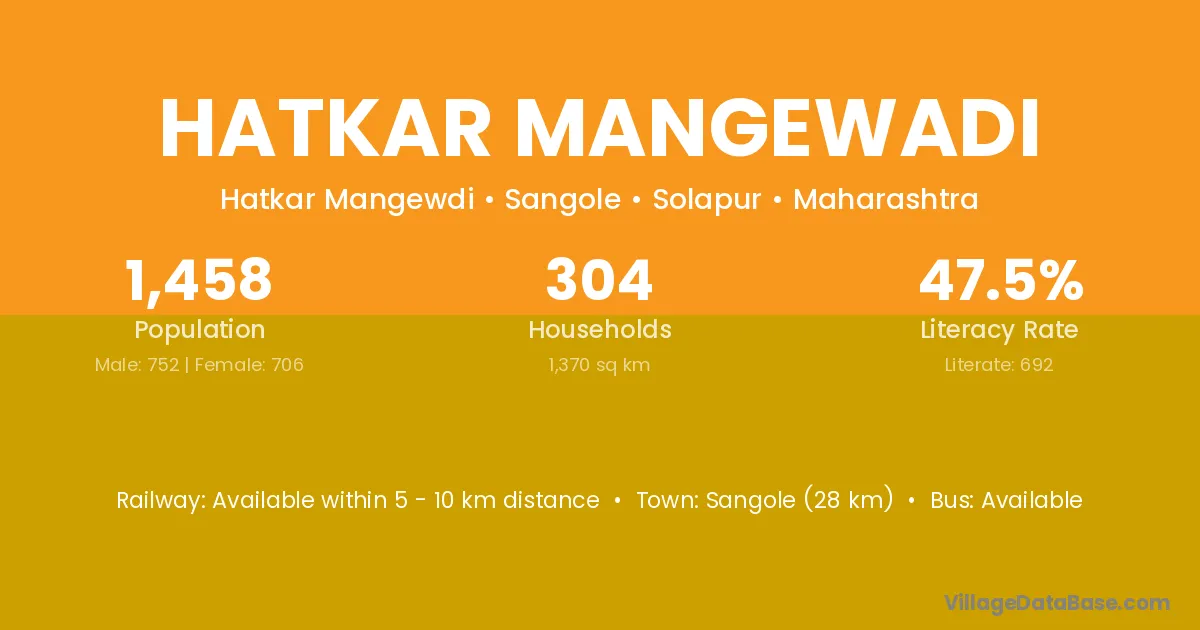 Sangole (28 km) is the nearest town to Hatkar Mangewadi village for major economic activities and is located approximately 28 km away.