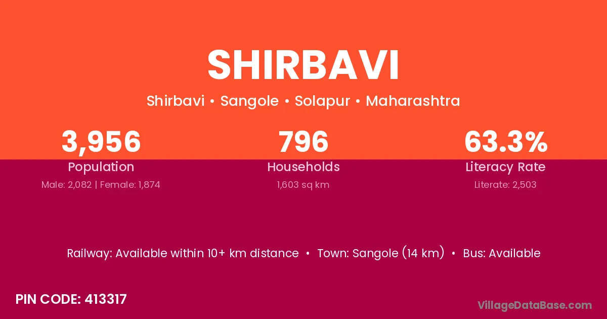 Sangole (14 km) is the nearest town to Shirbavi village for major economic activities and is located approximately 14 km away.