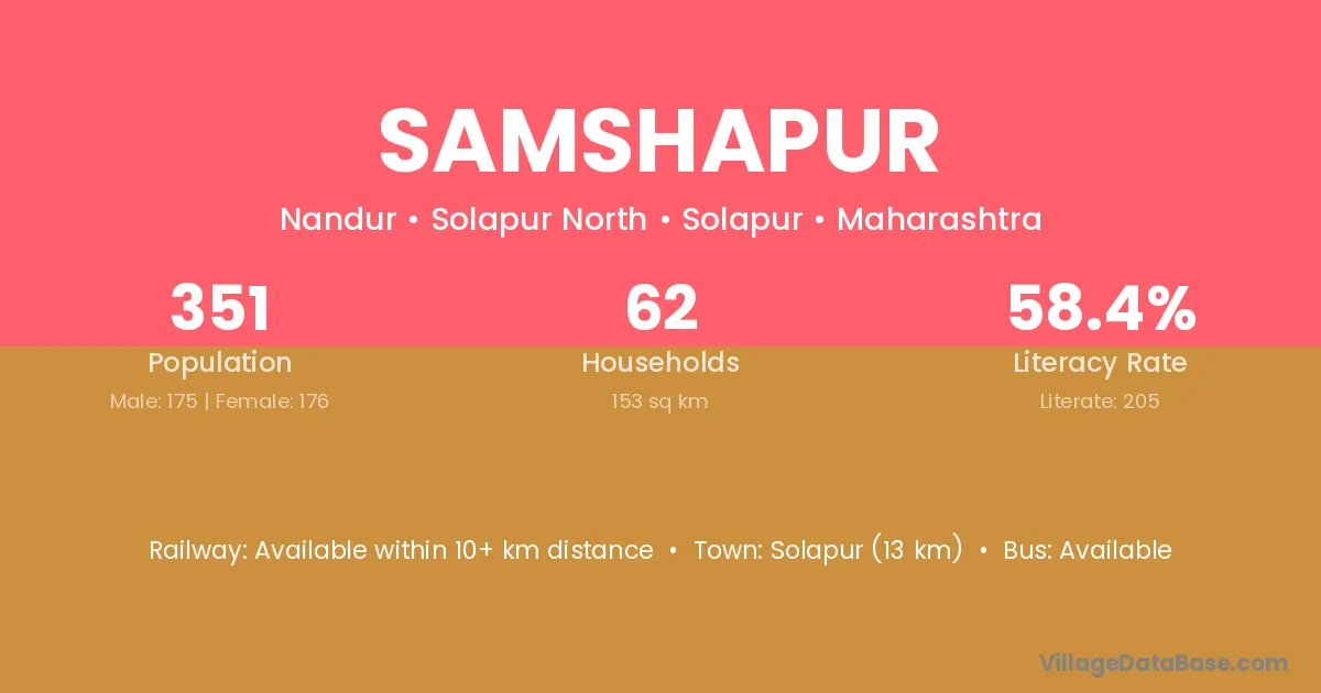 Solapur (13 km) is the nearest town to Samshapur village for major economic activities and is located approximately 13 km away.