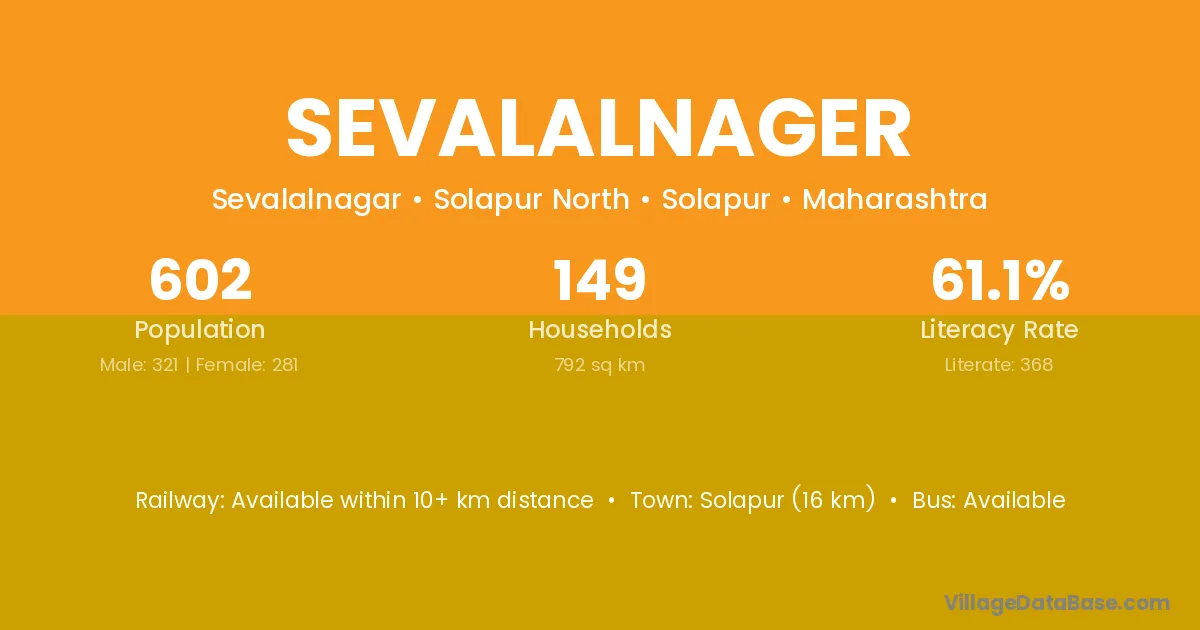 Solapur (16 km) is the nearest town to Sevalalnager village for major economic activities and is located approximately 16 km away.