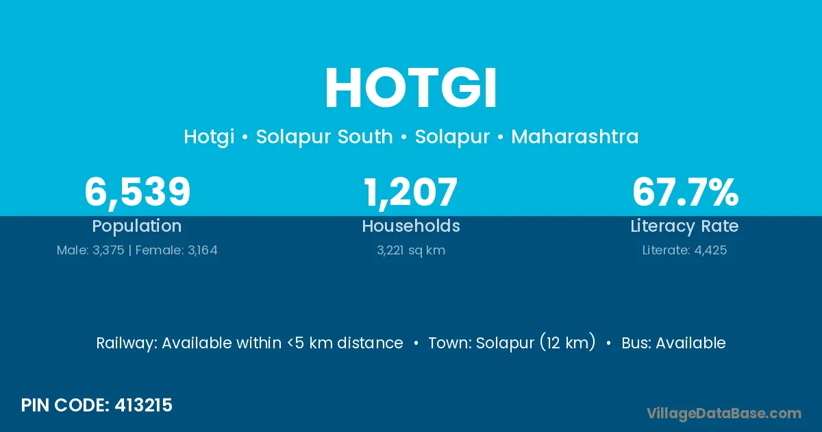 Solapur (12 km) is the nearest town to Hotgi village for major economic activities and is located approximately 12 km away.