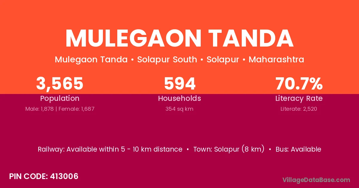 Solapur (8 km) is the nearest town to Mulegaon Tanda village for major economic activities and is located approximately 8 km away.
