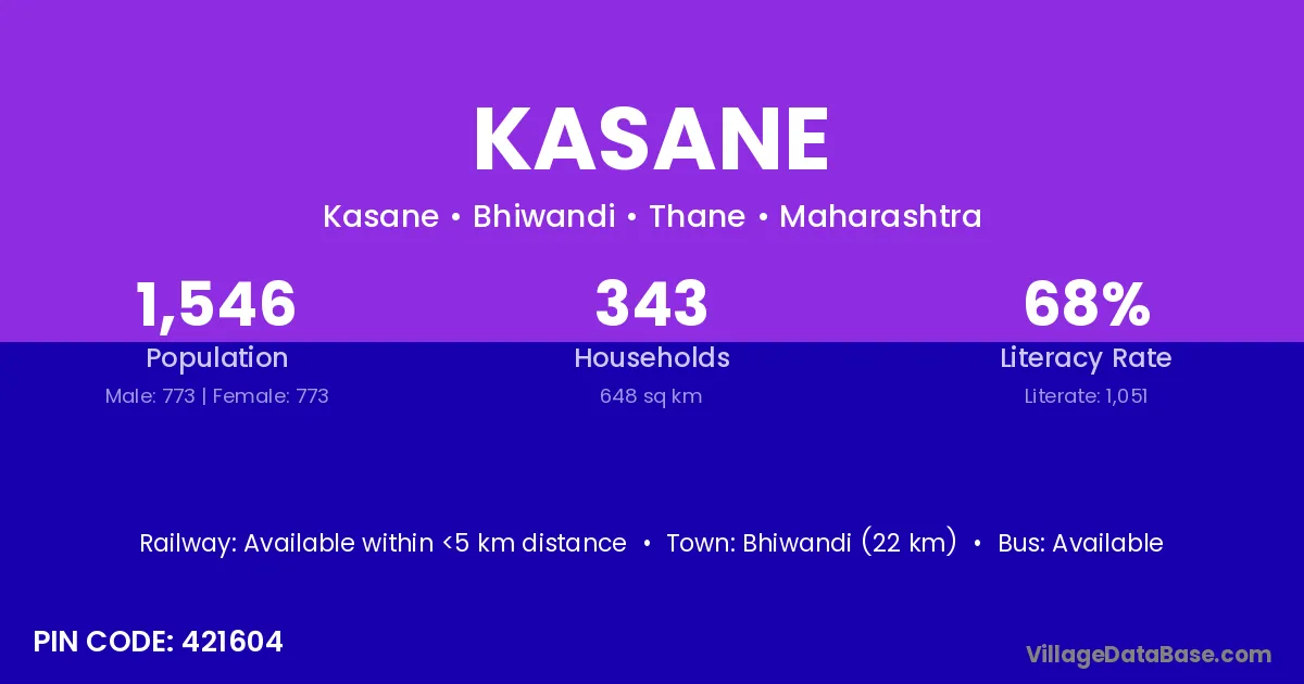 Bhiwandi (22 km) is the nearest town to Kasane village for major economic activities and is located approximately 22 km away.
