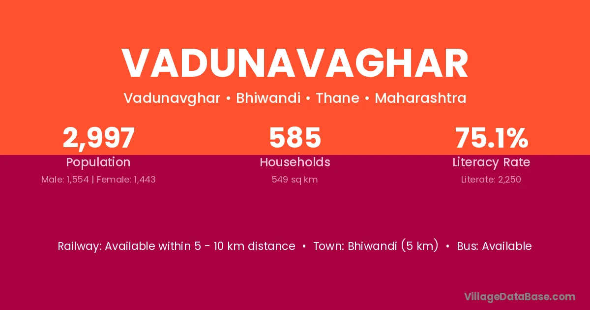 Bhiwandi (5 km) is the nearest town to Vadunavaghar village for major economic activities and is located approximately 5 km away.