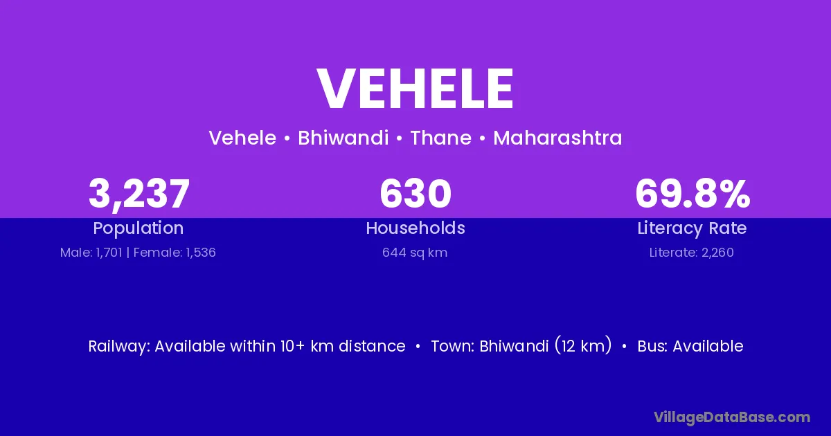 Bhiwandi (12 km) is the nearest town to Vehele village for major economic activities and is located approximately 12 km away.