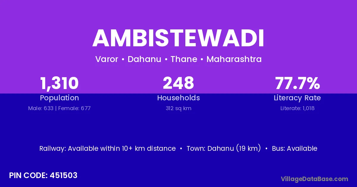 Dahanu (19 km) is the nearest town to Ambistewadi village for major economic activities and is located approximately 19 km away.