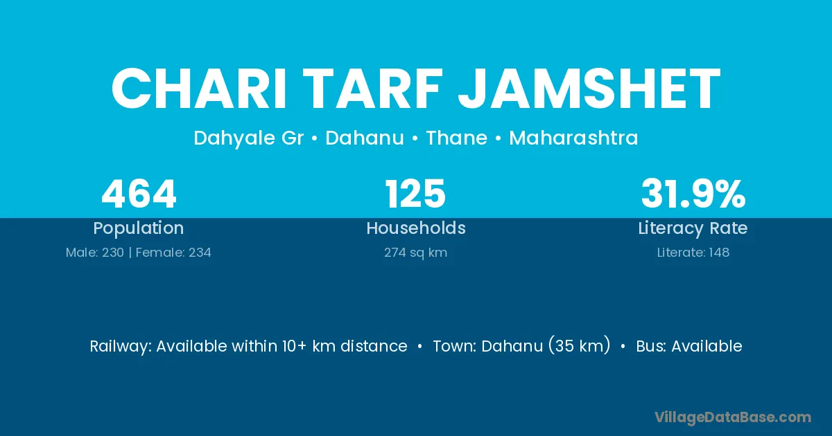 Dahanu (35 km) is the nearest town to Chari Tarf Jamshet village for major economic activities and is located approximately 35 km away.