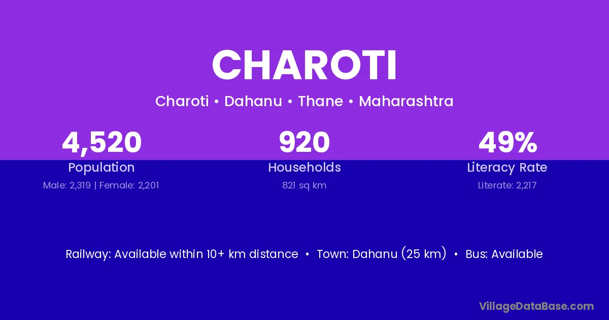 Dahanu (25 km) is the nearest town to Charoti village for major economic activities and is located approximately 25 km away.