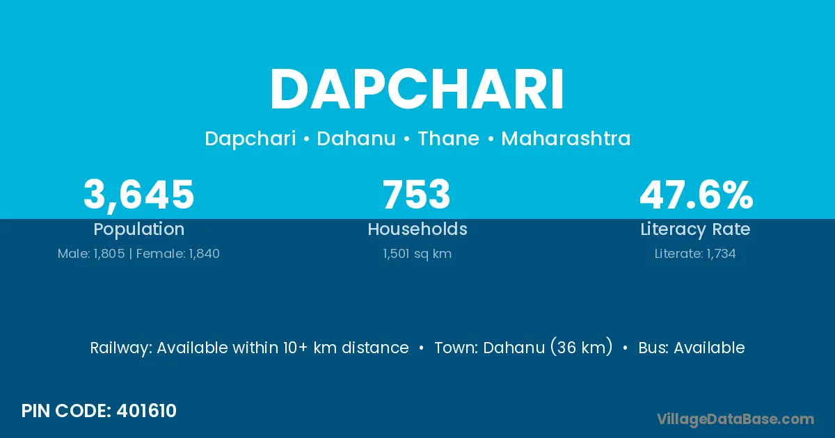 Dahanu (36 km) is the nearest town to Dapchari village for major economic activities and is located approximately 36 km away.